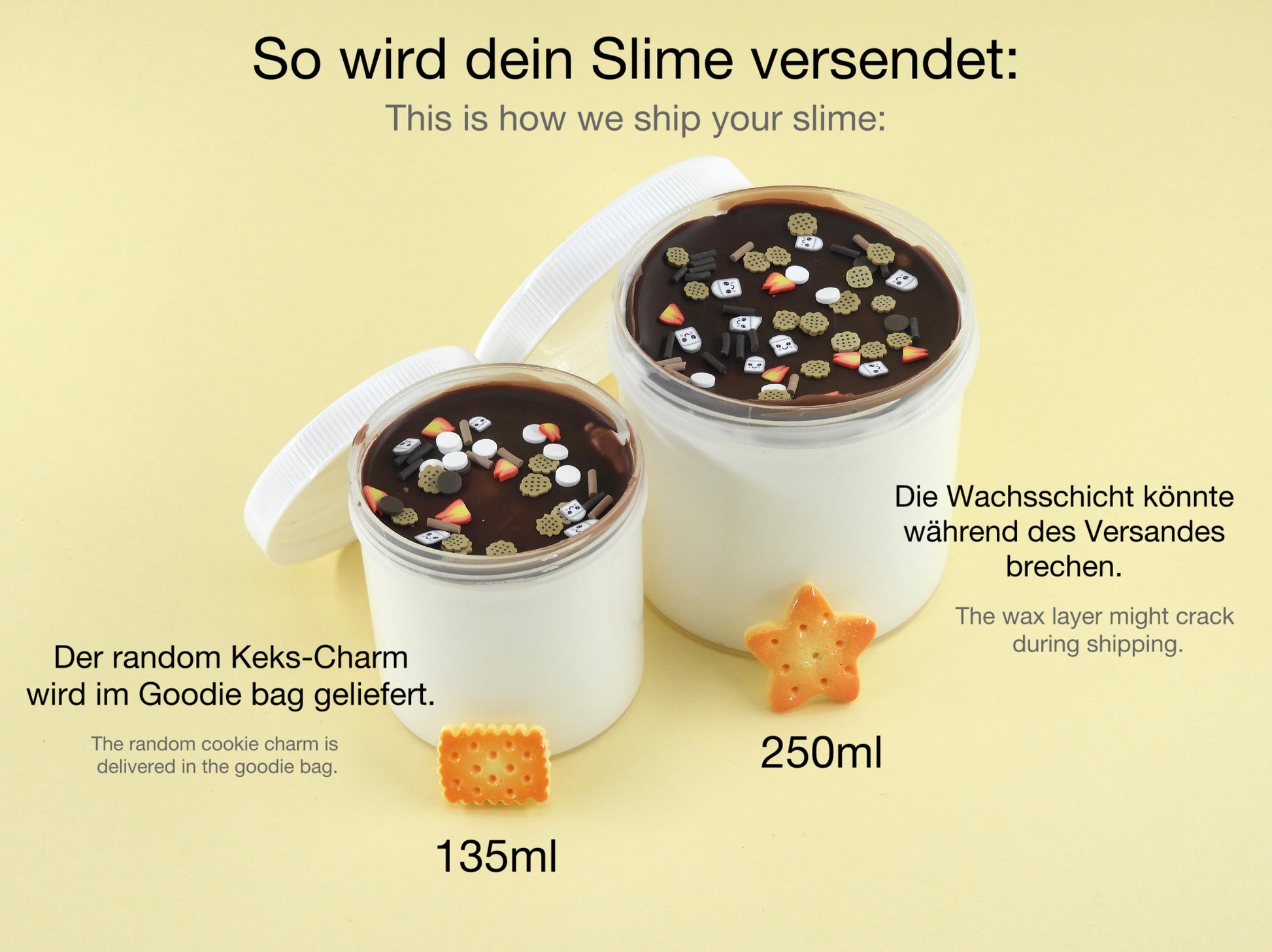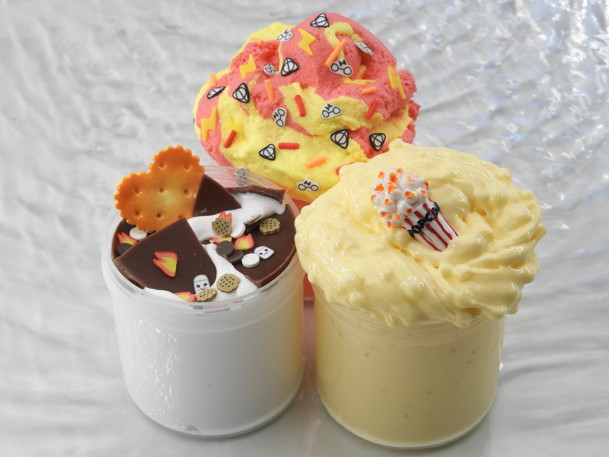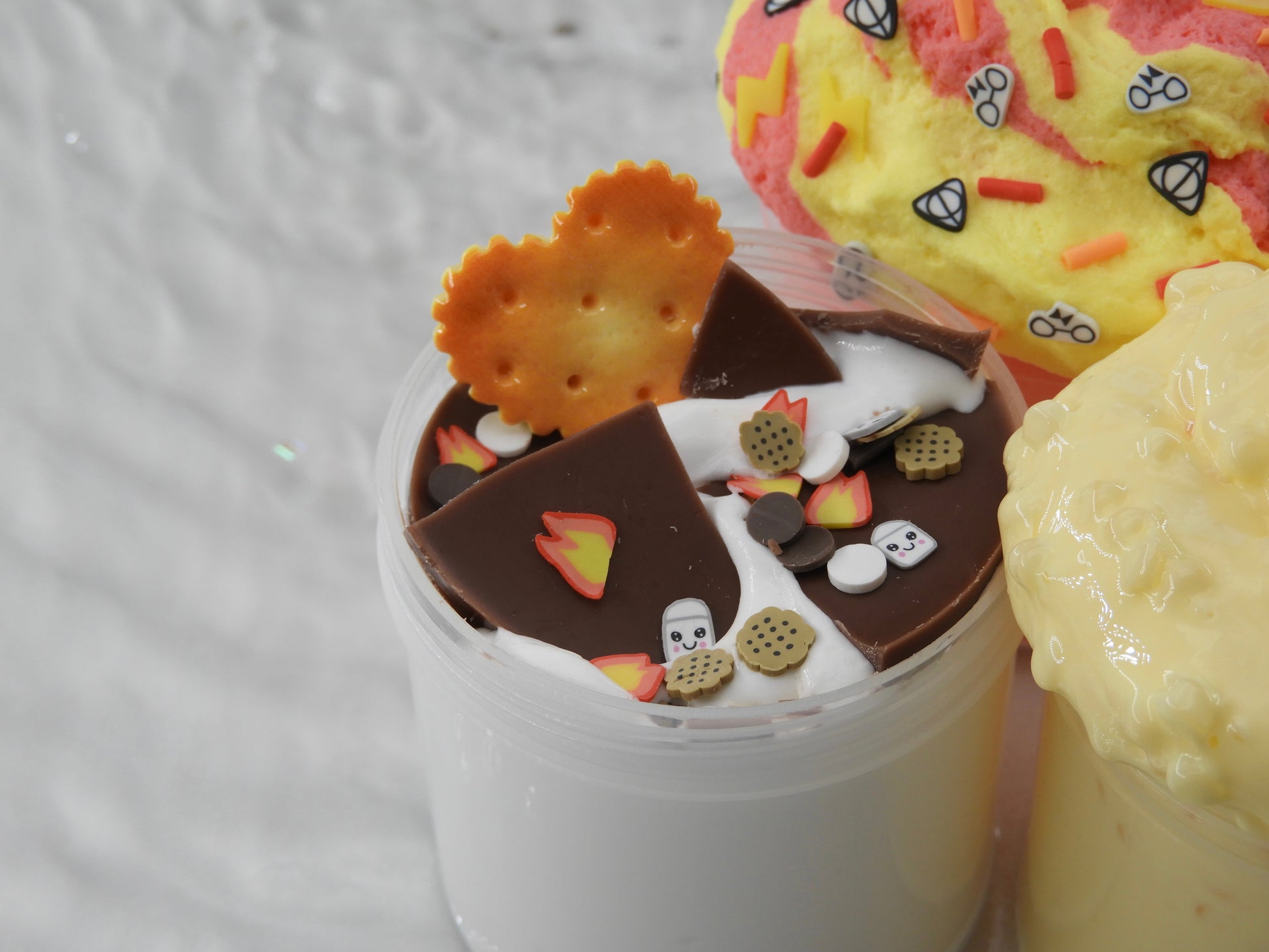 🔥 S’mores: Butter Slime mit echter Wachsschicht aus Rapswachs, verziert mit Marshmallow- und Lagerfeuer-Sprinkles sowie Keks-Charm, cremig weich nach dem Zerdrücken und duftend nach Keksen & Schokolade.