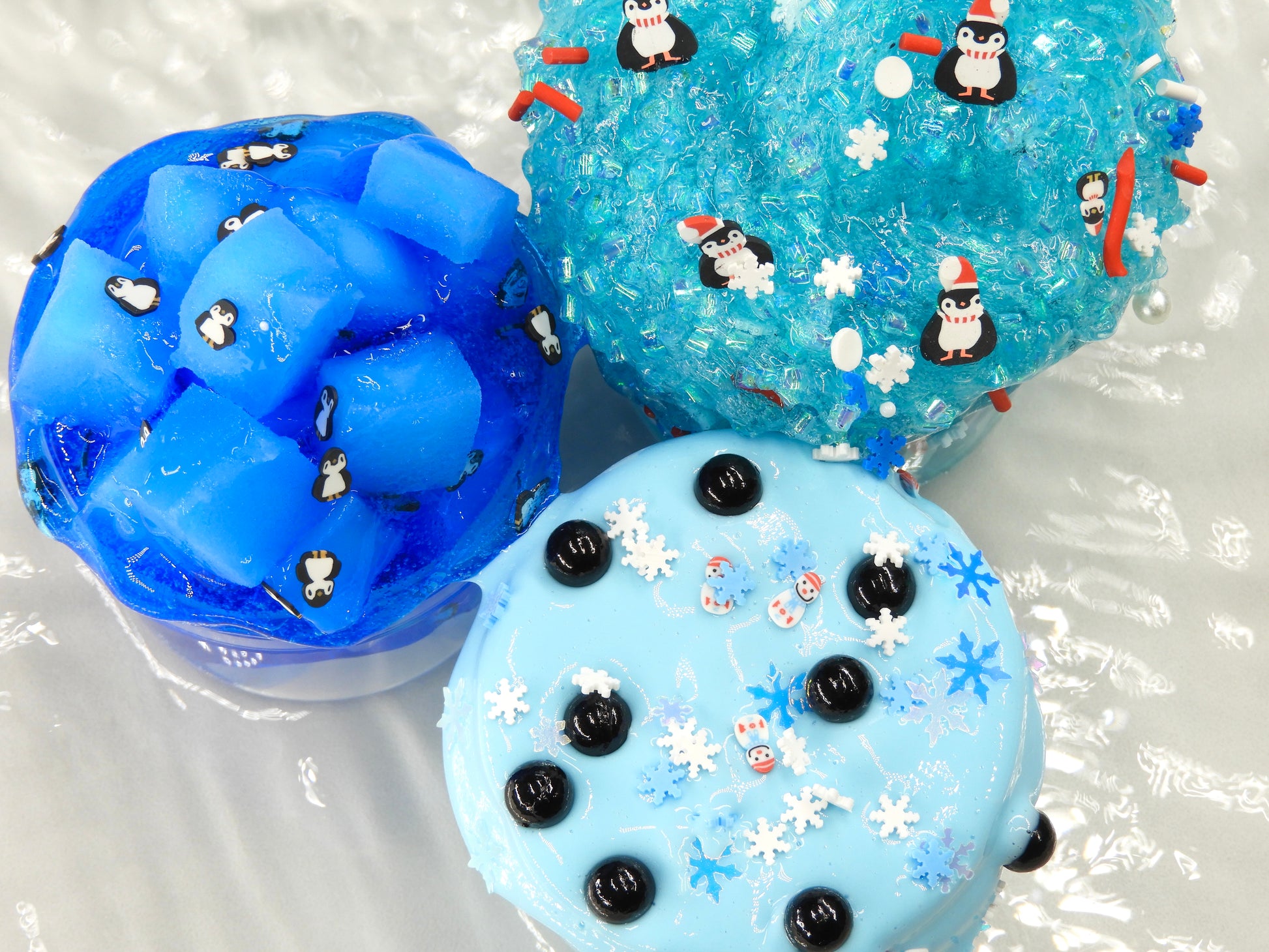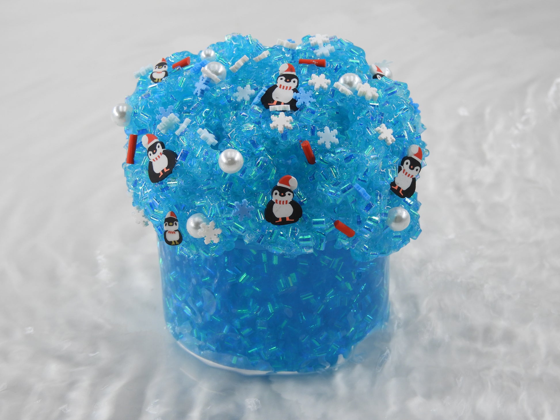 🐧 North Pole Penguins: Clear Bingsu Slime, der super crunchy und sizzly ist und Pinguin-Sprinkles mit Nikolausmützen enthält.