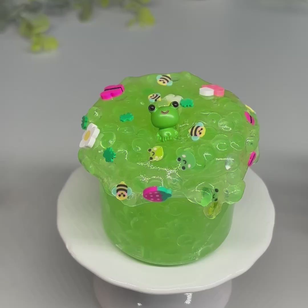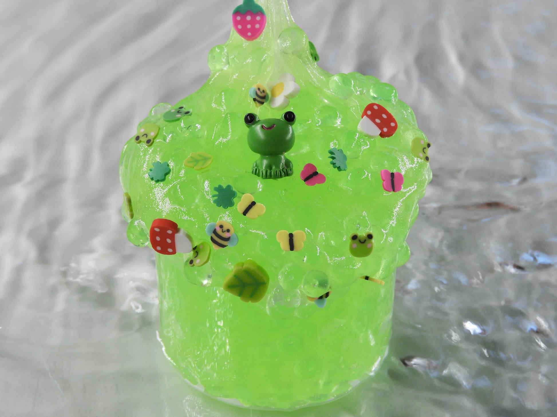 Unser Slime „Froggy Drops“ kombiniert eine Jelly x Fishbowl Textur, die beim Spielen für spannende crunchy Geräusche sorgt. Die Textur wird beim Kneten schön fluffy und lässt sich wunderbar inflaten, während durch die Fishbowl beads crunchy Geräusche entstehen. Ein süßer Frosch-Charm und Frühlings-Sprinkles Mix greifen das verspielte Design auf und „Froggy Drops“ riecht nach grünem Apfel. 🐸🍏