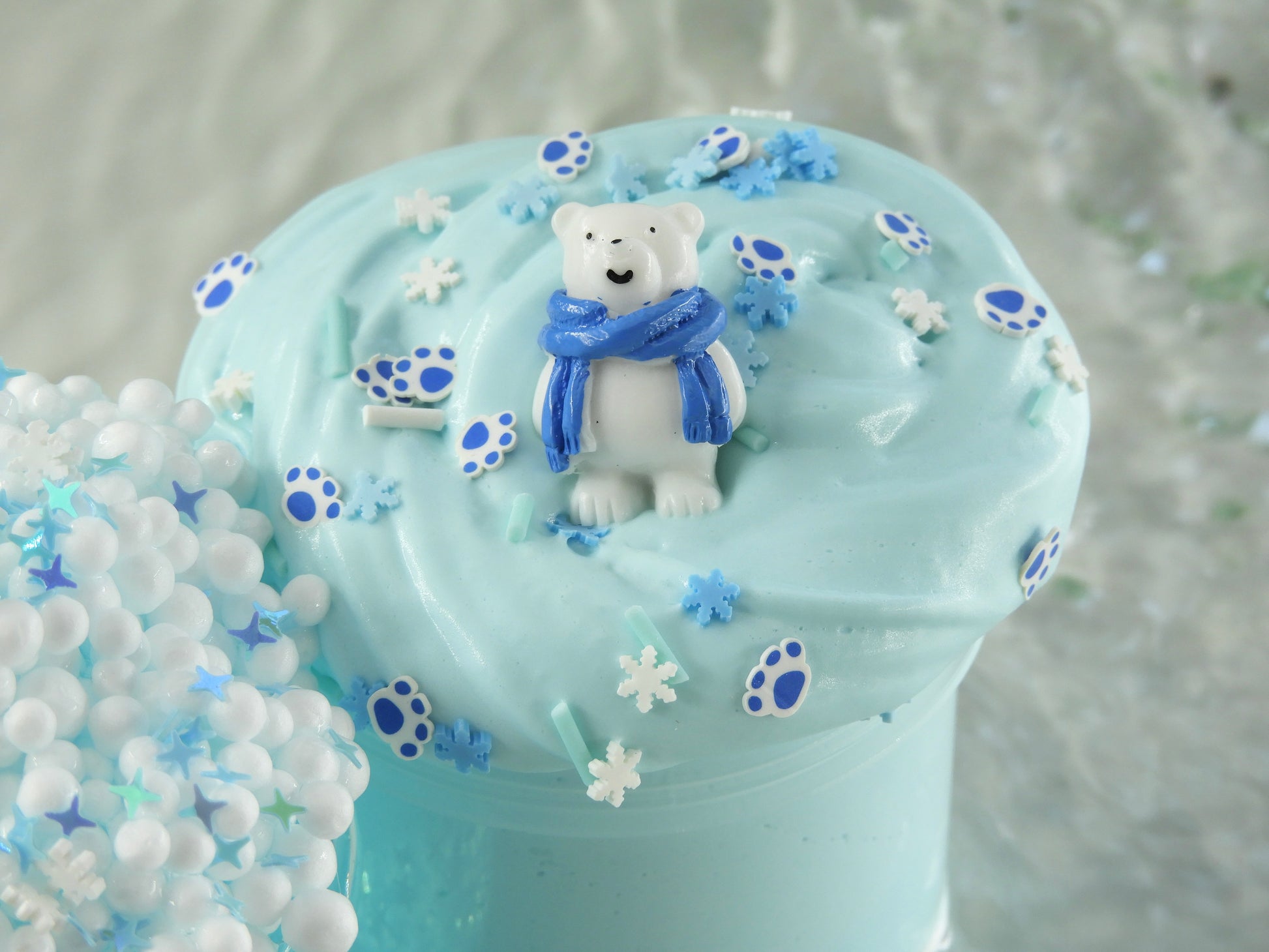 🐻❄️ Arctic Mousse: Butter Slime, super soft, cremig und fluffig, lässt sich wunderbar inflaten, dekoriert mit Eisbär Charm und Pfoten-Schneeflocken Sprinkles, duftet nach Bodylotion.